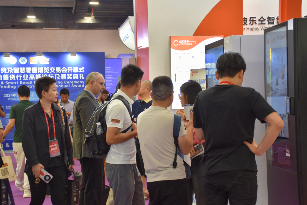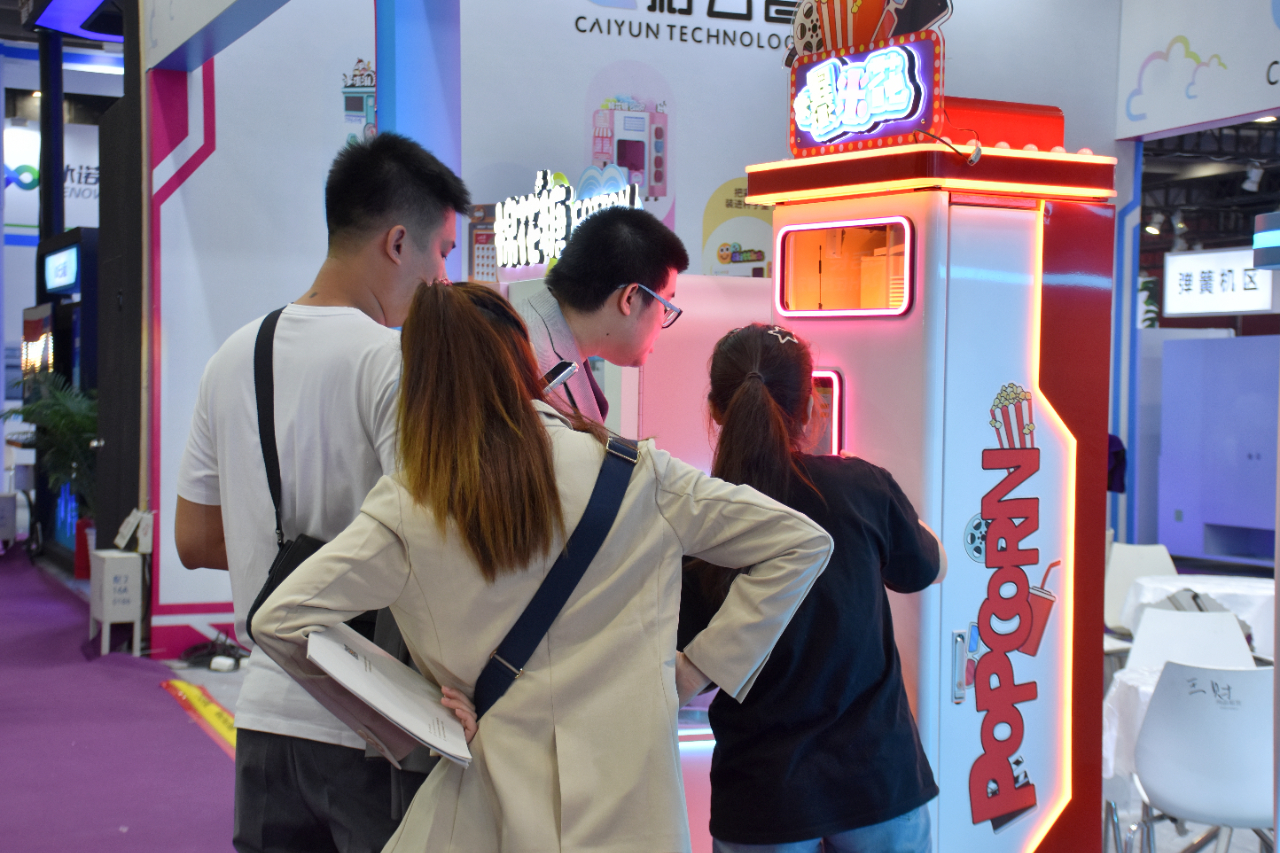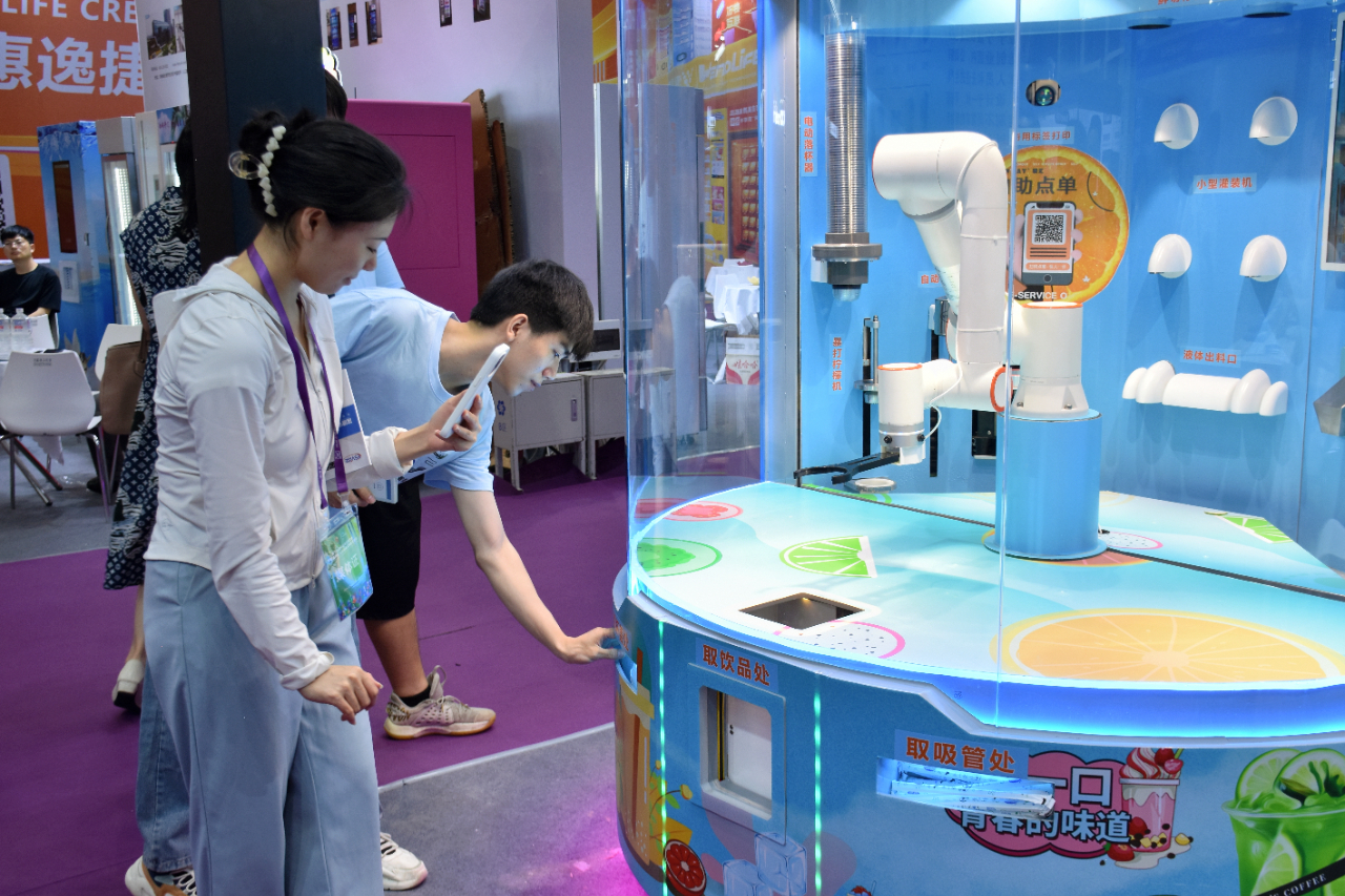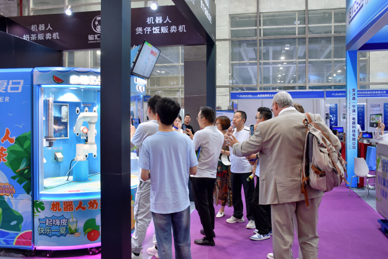 現(xiàn)場(chǎng)展示了自動(dòng)制作咖啡、奶茶、爆米花、棉花糖、冰激凌、煲仔飯等餐飲產(chǎn)品的無(wú)人零售機(jī)器。